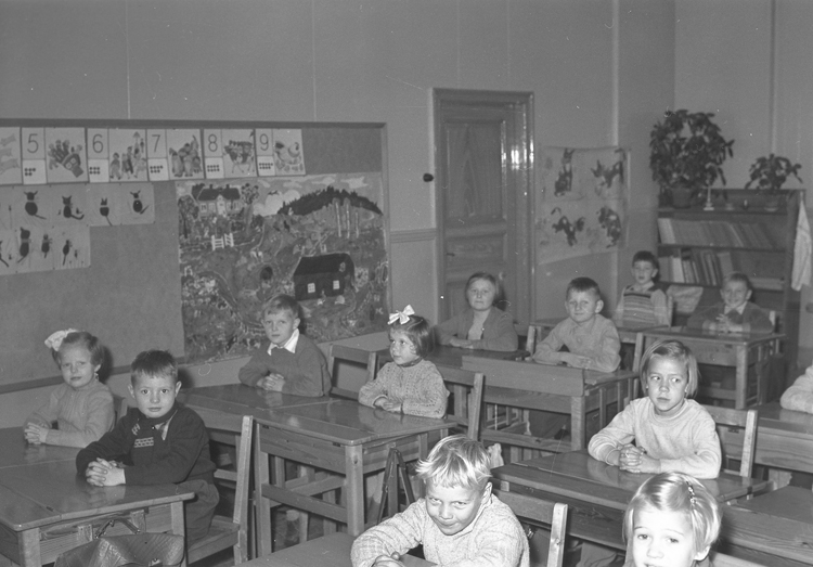 Text till bilden: "Lysekil. Lysekils Folkskolor. Skolklass. Interiör. 1954"