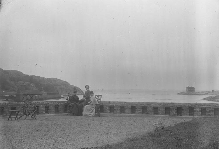 "Societetsterrassen, Marstrand. Tre personer i sittgrupp" enligt text till fotografiet
