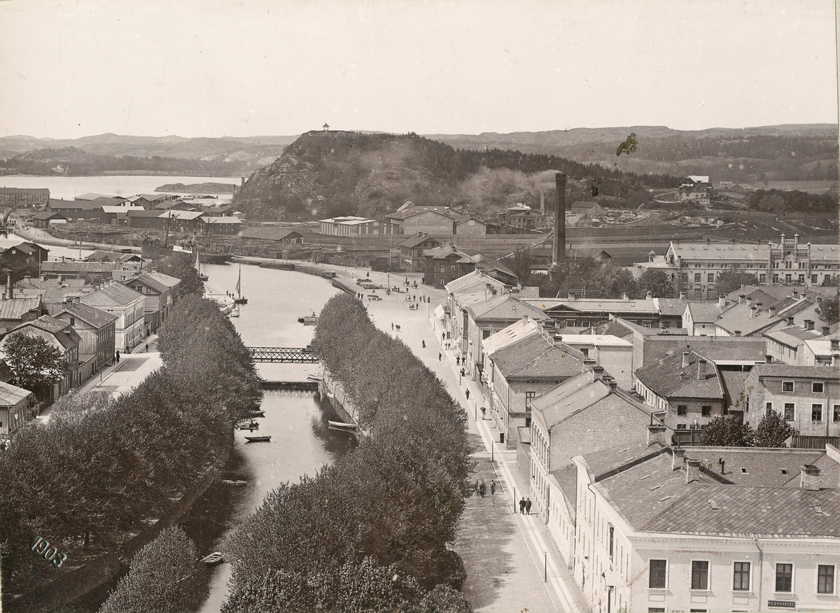 Vy över Uddevalla, hamnen, Kampenhof, Bäveån, hamngatan norra & södra.
