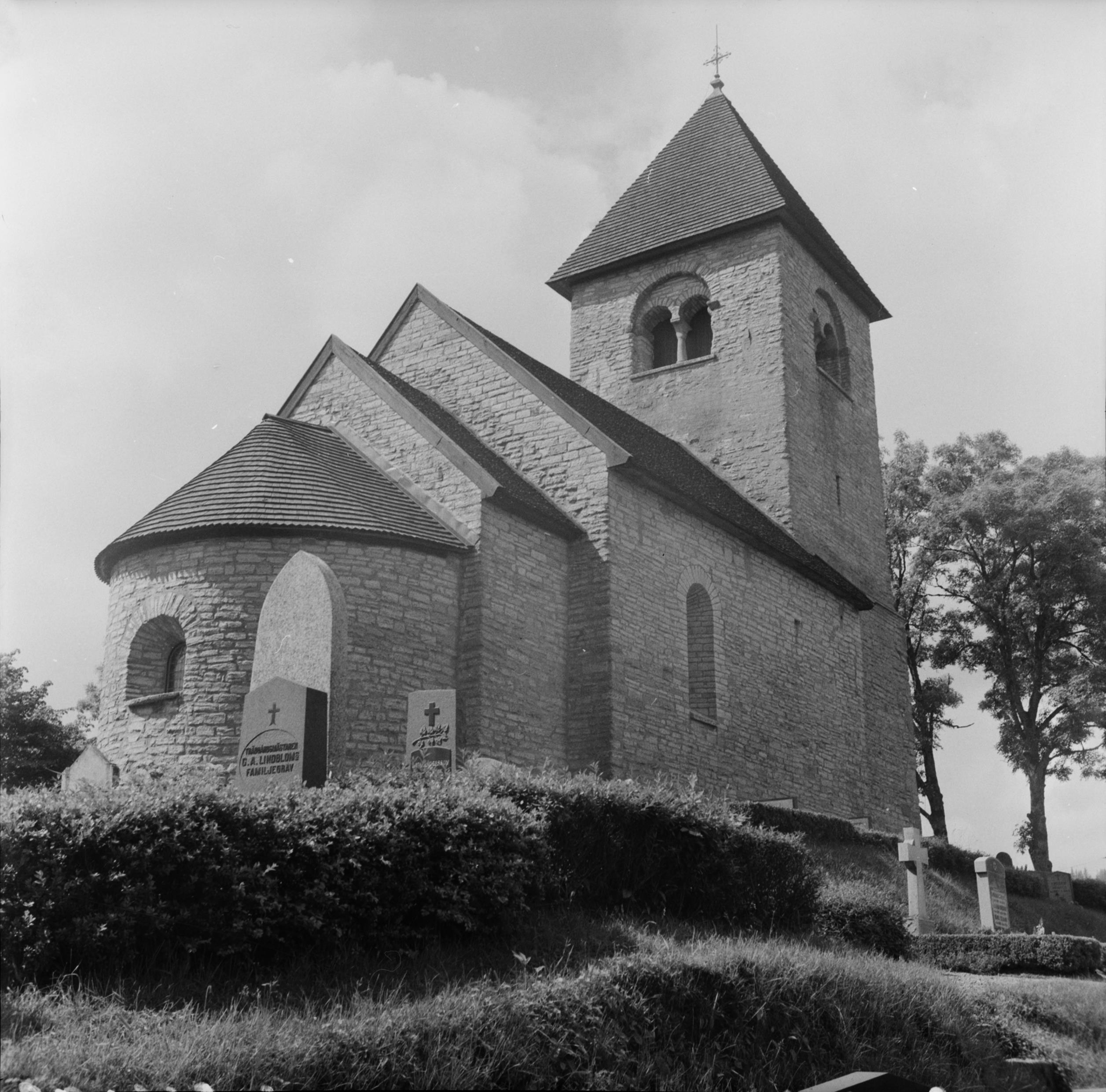 Kyrkan från nordöst. Kyrkan är romansk med kor, absid och västtorn. Snabbinv.
