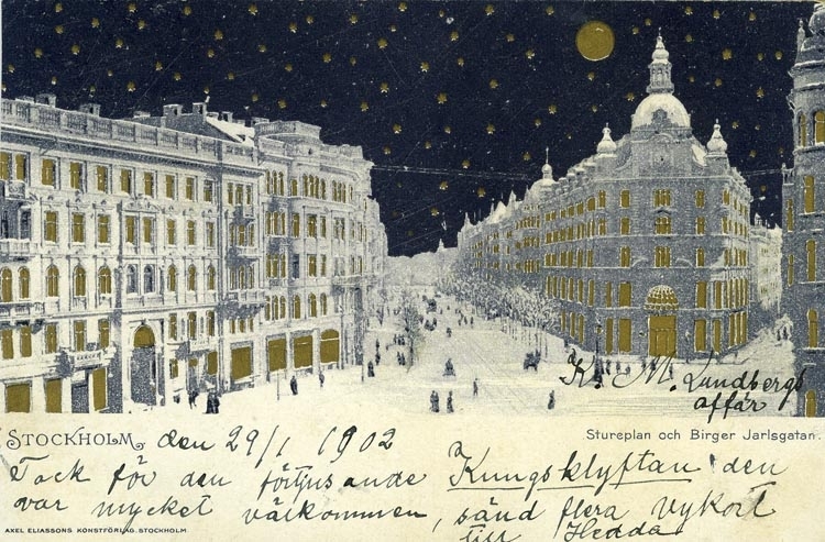 Notering på kortet: Från Stockholm. Stureplan och Birger Jarlsgatan.