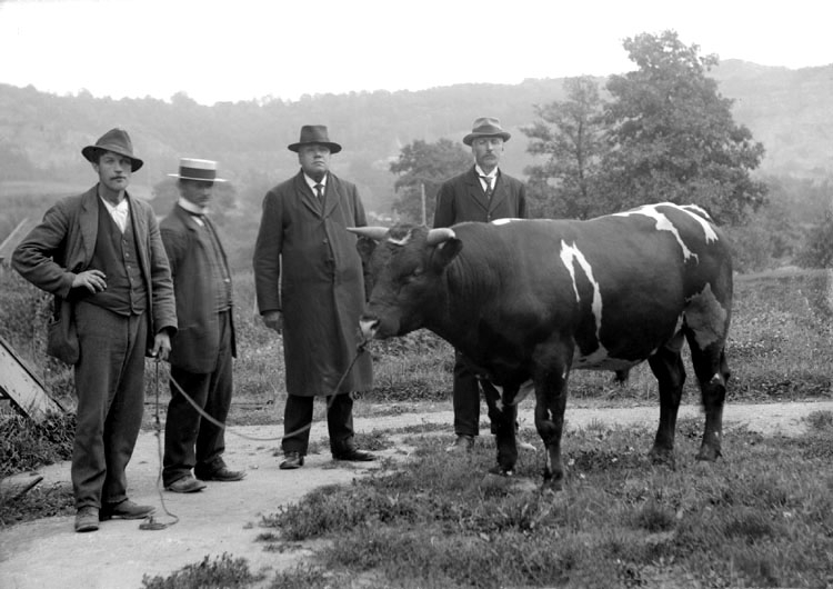 Enligt senare noteringar: "Kreaturshandlaren Axel Ferdinand Karlsson ("Millingen") tredje från vänster. Fotot taget utanför Färdigs hus.
