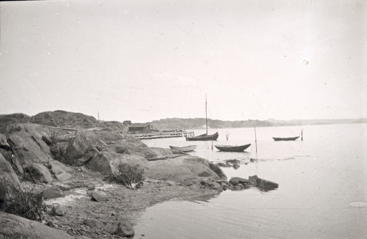 Rossö brygga. "Rossö brygga med några fiskebåtar, avslipade släta bergväggar vid sjökanten."