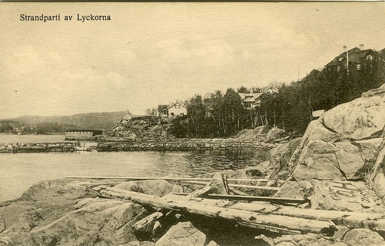 Enligt Bengt Lundins noteringar: "Strandparti av Lyckorna. Vrakgods. Badhus".