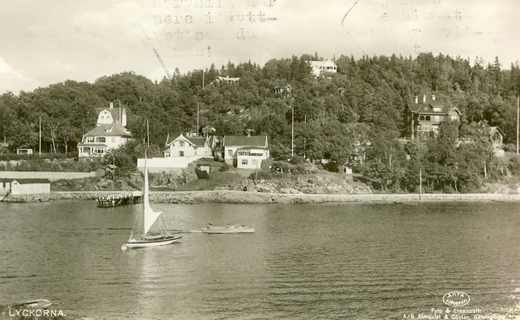 Björkås pensionat numera vitmålat. Båtbryggan. (L Havsvik) 1935-1940".
