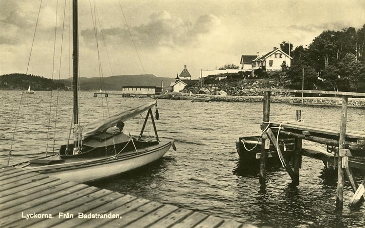 Enligt Bengt Lundins noteringar: "Lyckorna. Från badstranden. Bryggor. Klocktornet".