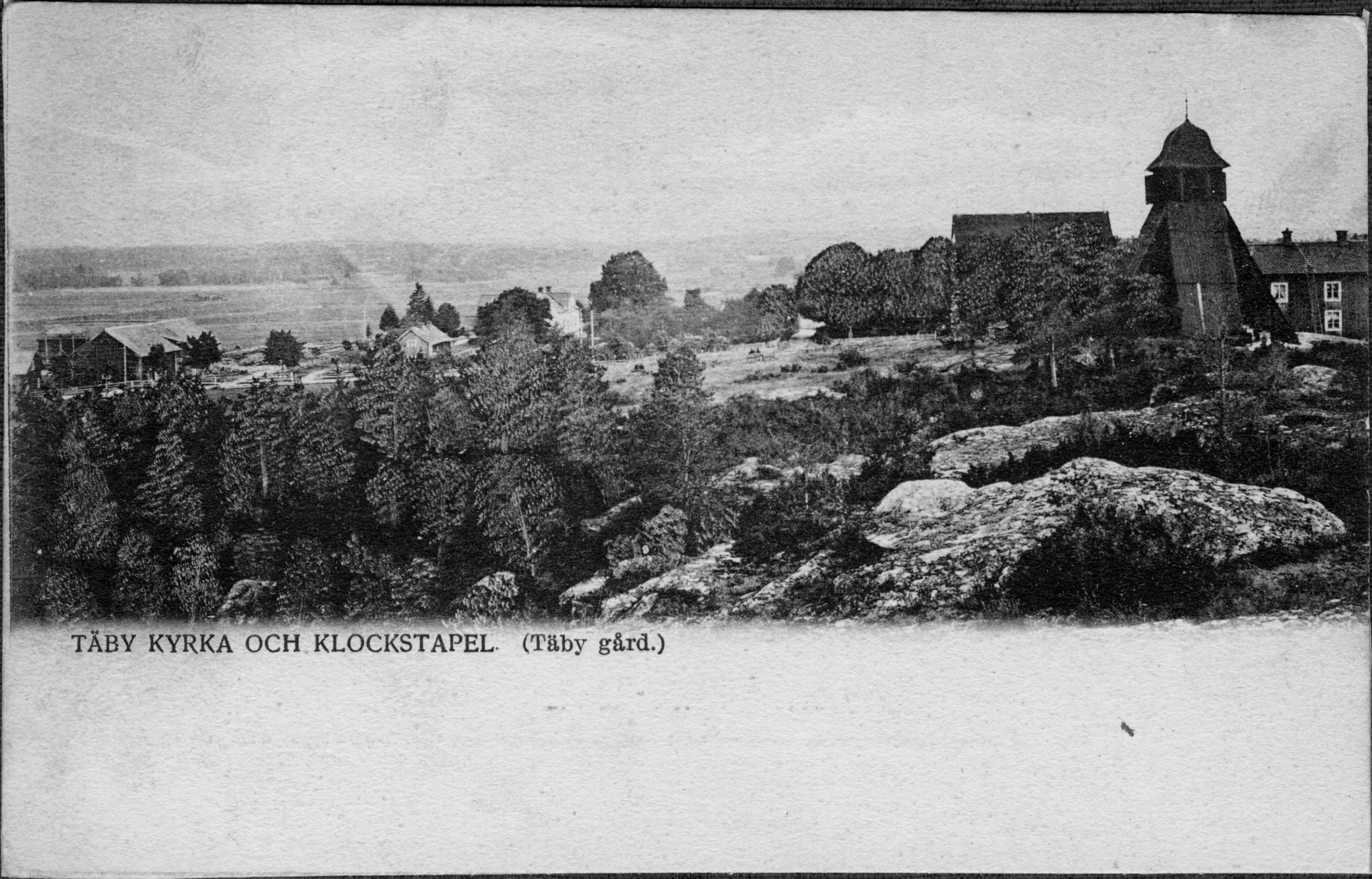 Kyrkan och klockstapeln. Vykort.