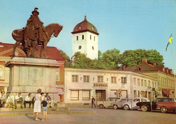 Kungstorget i Uddevalla med klocktornet och Karl X statyn