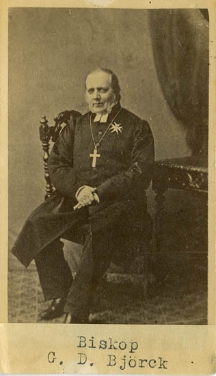 Biskop Gustaf Daniel Björck f. 1806 i Götheborg, lektorson. Till Uppsala 1822, magister der 1833. Collega i Götheborg 1831. Prestvigd 1834. Stadskatekt 1840. Contraktsprost 1849. Kyrkoherde i U-a 29/12 1842. Install. af Bisk. Bruhn 20/7 1845. Afskedspredikan 3/7 1853. Theol. adjunkt Upsala 1853. Biskop i Götheborg 1856. Gift med Sofia Elis. Pripp. Död 1880 80 år gamal i Björkeris Prestg. Barn Elise g. prost Heuman i Morlanda. Ernst f. 1838. Comm. i Götheborg. Skald. Död 1868".