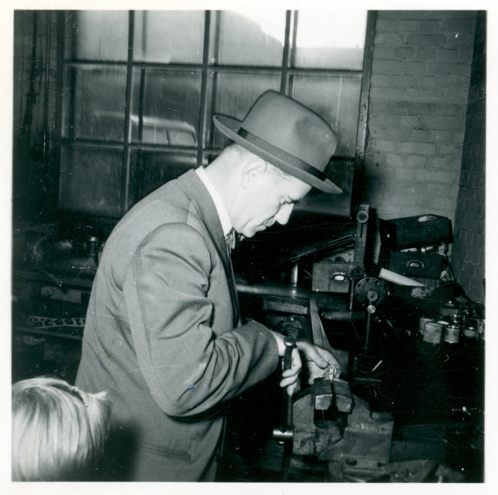 En man står i kostym och hatt vid ett skruvstäd på cykelverkstaden Monark
