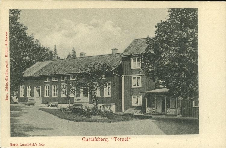 Tryckt text på vykortets framsida: "Gustafsberg," "Torget."