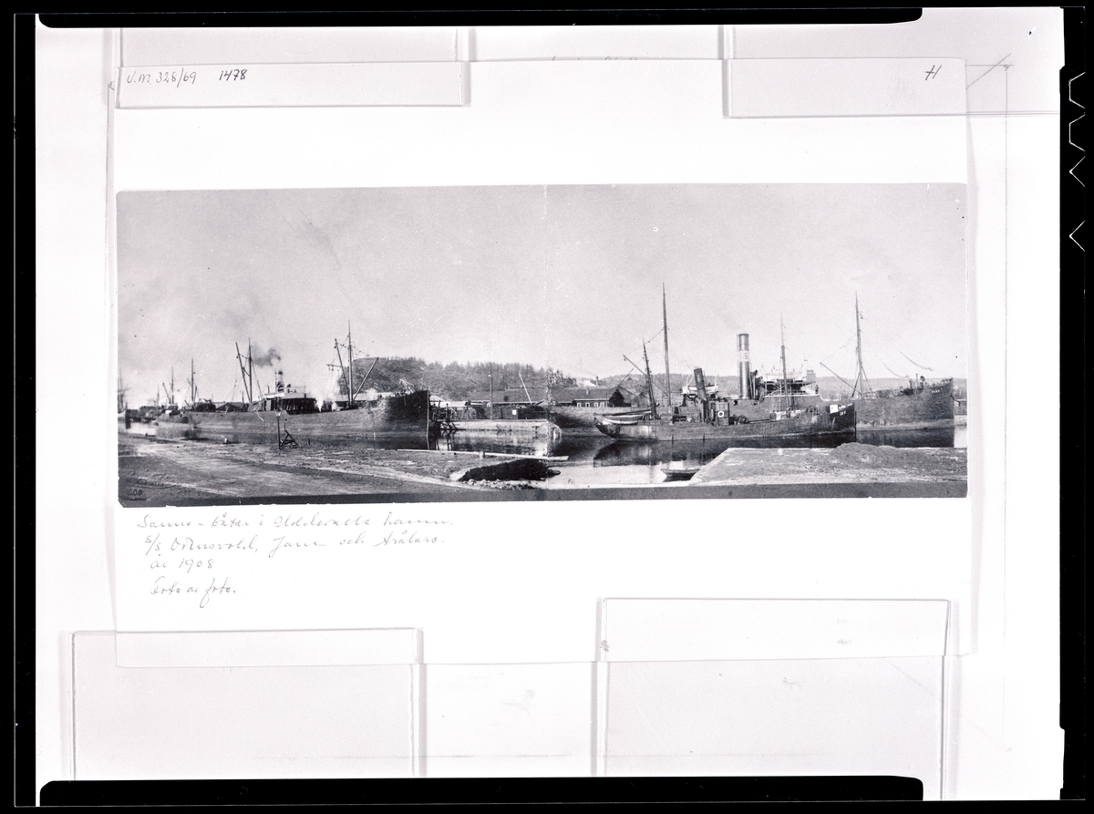 Text på kortet: "Sanne-båtar i Uddevalla hamn. s/s Odensvold, Jane och trålare, år 1908. Foto av foto".