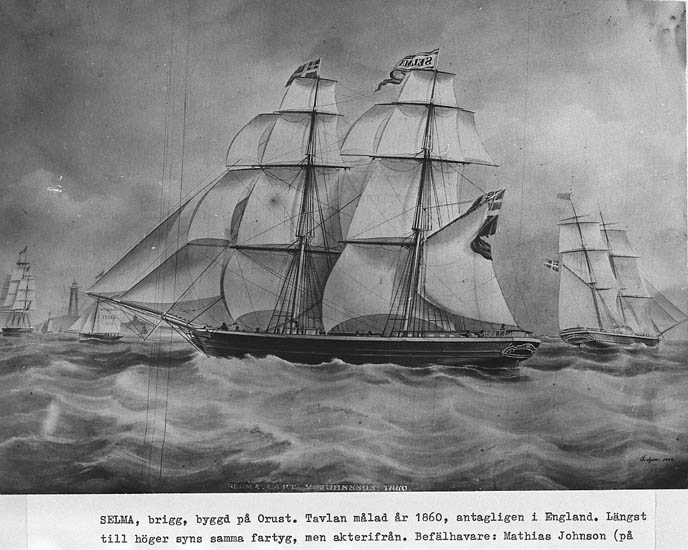 Text som medföljer kortet: "Selma, brigg, byggd på Orust. Tavlan målad år 1860, antagligen i England. Längst till höger syns samma fartyg, med akterifrån.