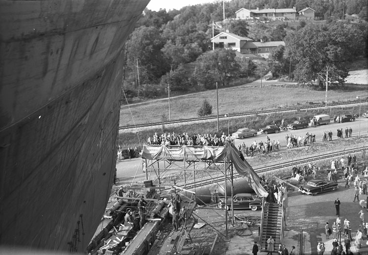 Inför sjösättning och dop av fartyg 114 M/S Hjördis Thordén.