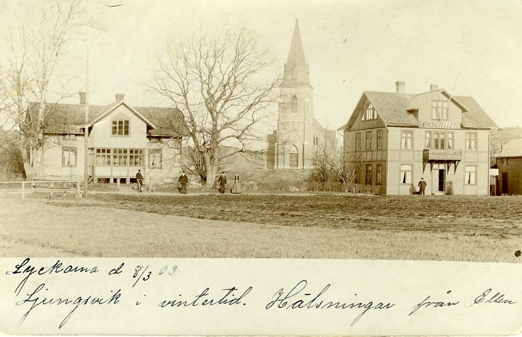 Enligt Bengt Lundins noteringar: "Ljungsvik. Kyrkan. Badhotellet. Lyckorna".