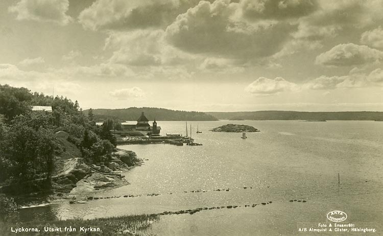 Enligt Bengt Lundins noteringar: "Utsikt från kyrkan. Ångbåtsbryggan i motljus".