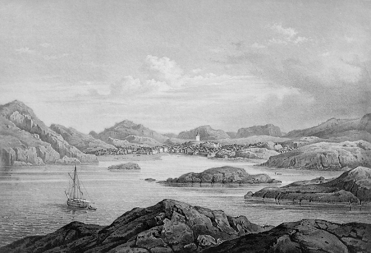 Enligt tidigare noteringar: "Avfotografering av litografi från 1850-talet konstnären okänd. Bäveåns utlopp och Skansberget med Uddevalla stad."