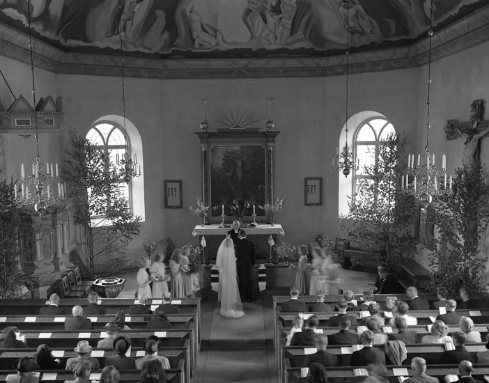 Text som medföljde bilden: "1948. No 12. Kyrkbröllop Olof Norborg, Foss".