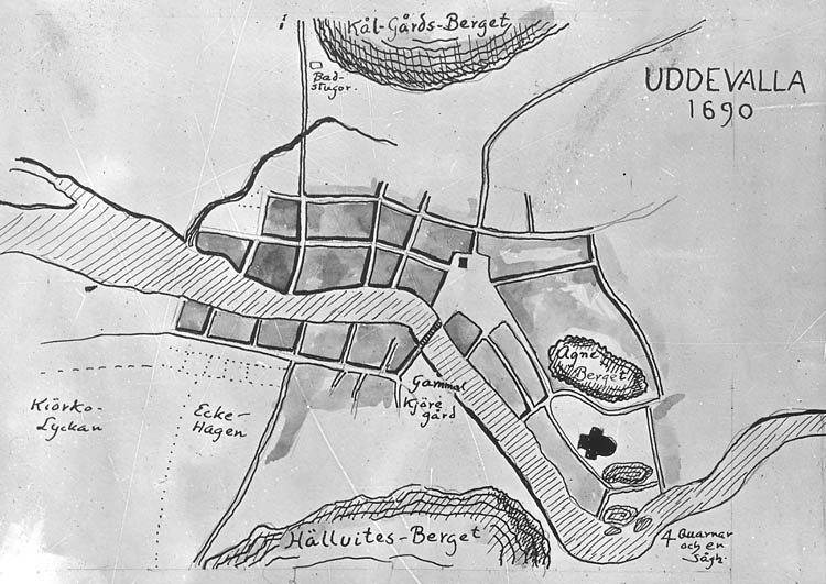 Akvarell över inre hamnen med bebyggelse i Uddevalla.