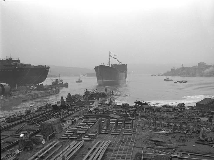 Sjösättning av tankfartyg.