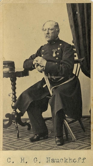 Text på kortets baksida: "Carl Henric Gottlieb Nauckhoff, f. 1802. Fullmakt 1819 akt-26. Afvsked som överste 1868".