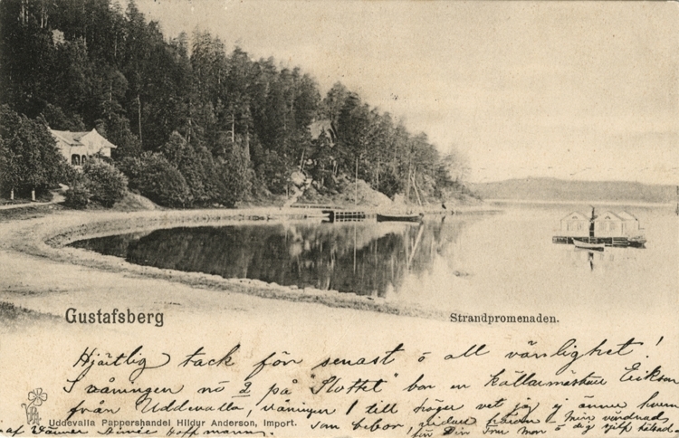 Tryckt text på vykortets framsida: "Gustafsberg strandpromenaden."