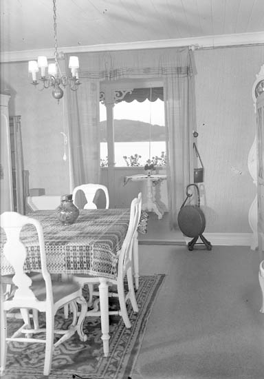 Text till bilden:"Bord med vita stolar, ett runt vittbord, en gångång, taklampa med ringklocka. Alphyddan".