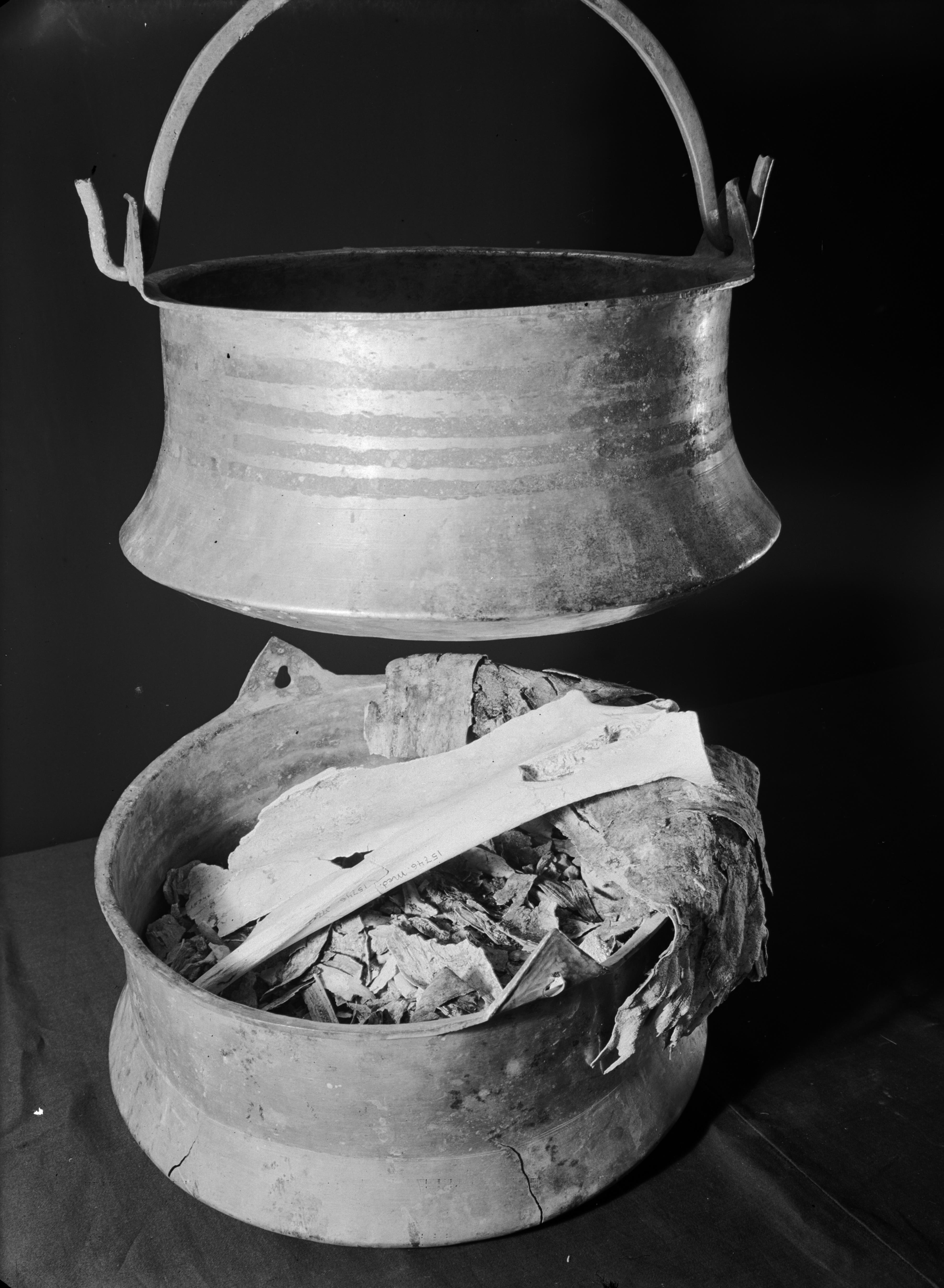Två bronskittlar från järnåldern, gravfynd från Medelpad. Den övre från Vestland, Sköns socken, SHM 17062. Den nedre från Kvissle, Njurunda socken, SHM 15746.