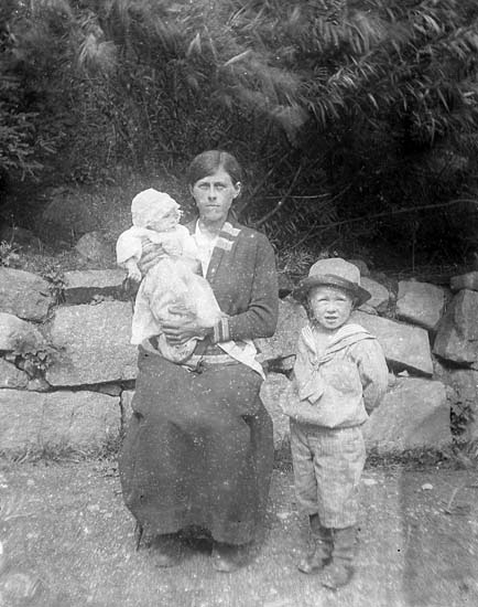 Enligt notering: "Kvinna med barn, Hulda Thim, Elsa + Hendry, Skistad".