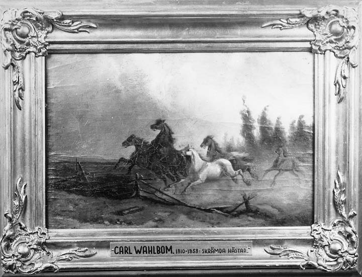 Text på tavlan: "Carl Wahlbom. 1810-1858: Skrämda hästar".