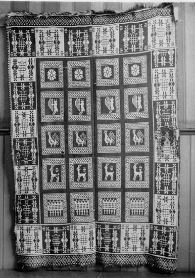 I vävnadens spegel syns den spelande haren eller Kung David med harpan, även tuppen eller den galande hanen samt hjorten, ibland kallad den längtande hjorten och hällkistan, också kallad Kristi boningar, Guds faders hus eller de himmelska boningarna. I bården syns Kristusmonogrammet IHS med törnekrona runtom. Geometriskt mönsterbård och frans i båda kortändarna. Täcket sammanfogat av två våder med söm på mitten. Lagning syns i bården på högersidan.