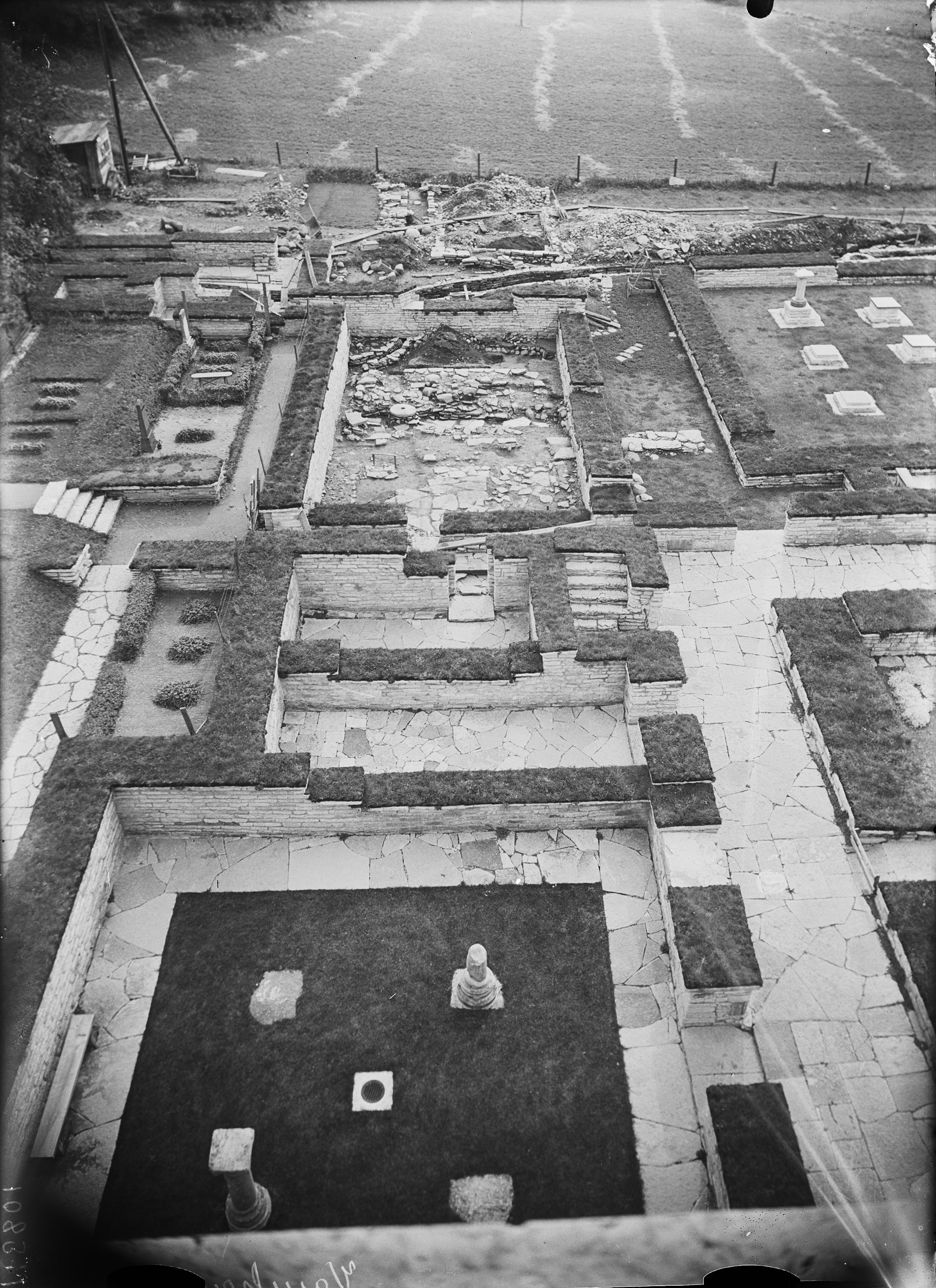 Östra längan och delar av abbotshus, korgång och refektorium från norr. Undersökning under golven pågår i östra längans sydligaste rum, munkarnas samlingsrum.