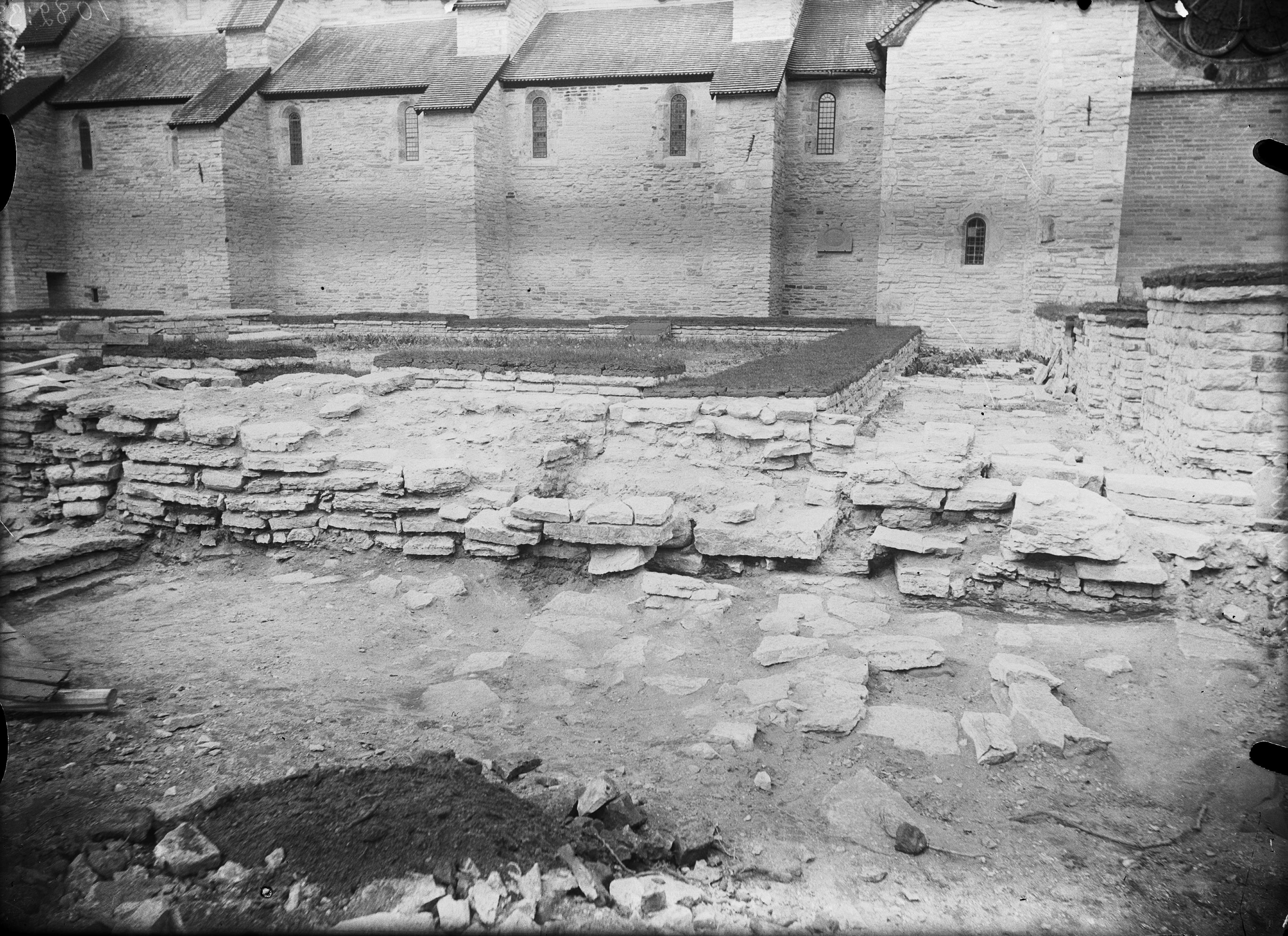 Muren mellan refektoriets förrum och östra längan. Längst till vänster yttersidan av förrummets östra mur. Påmurningen på muren ej borttagen. Från söder.