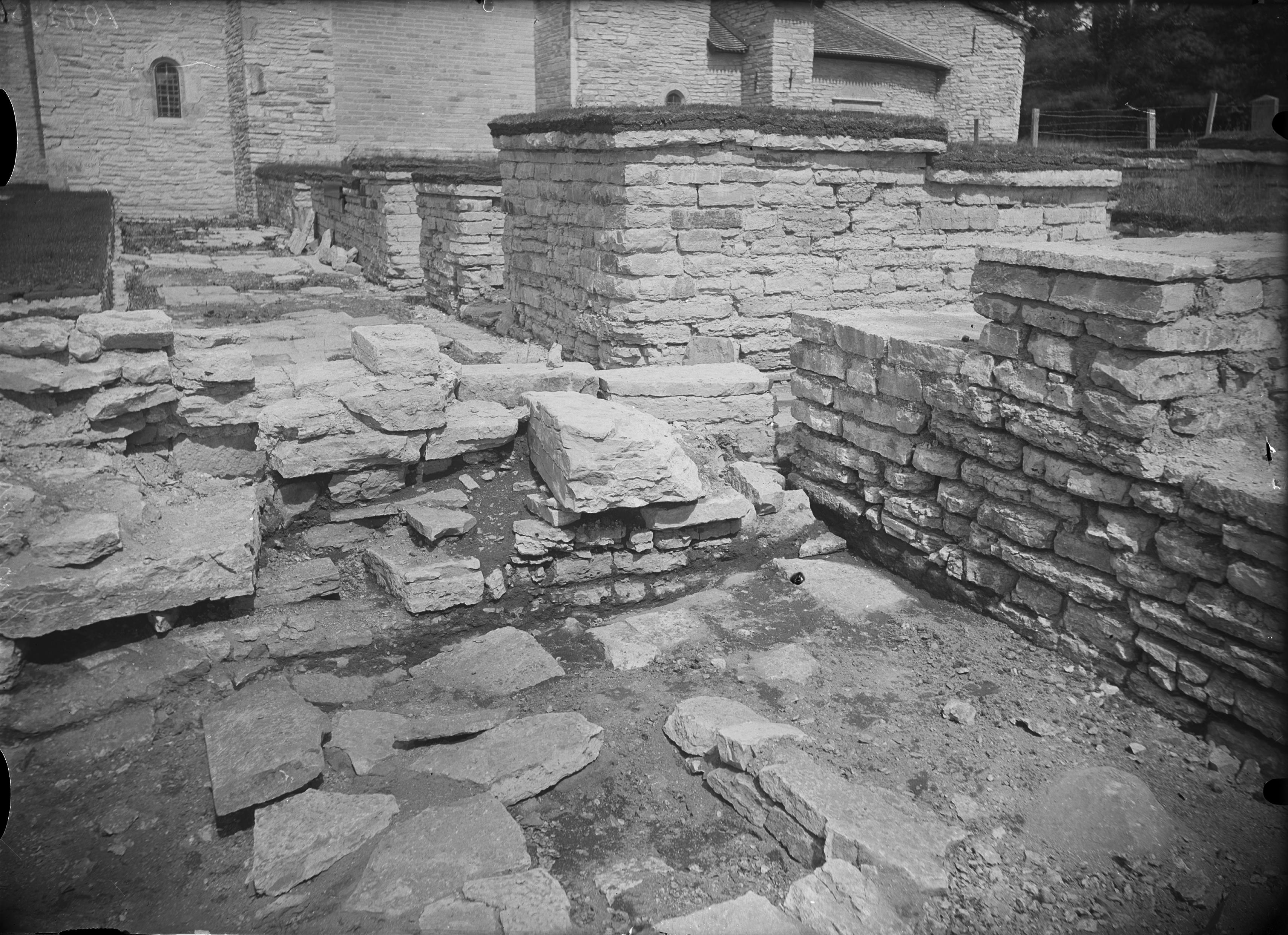 Muren mellan refektoriets förrum och östra längans östligaste del. Östra längans murar till höger konserverade. Från sydsydväst.