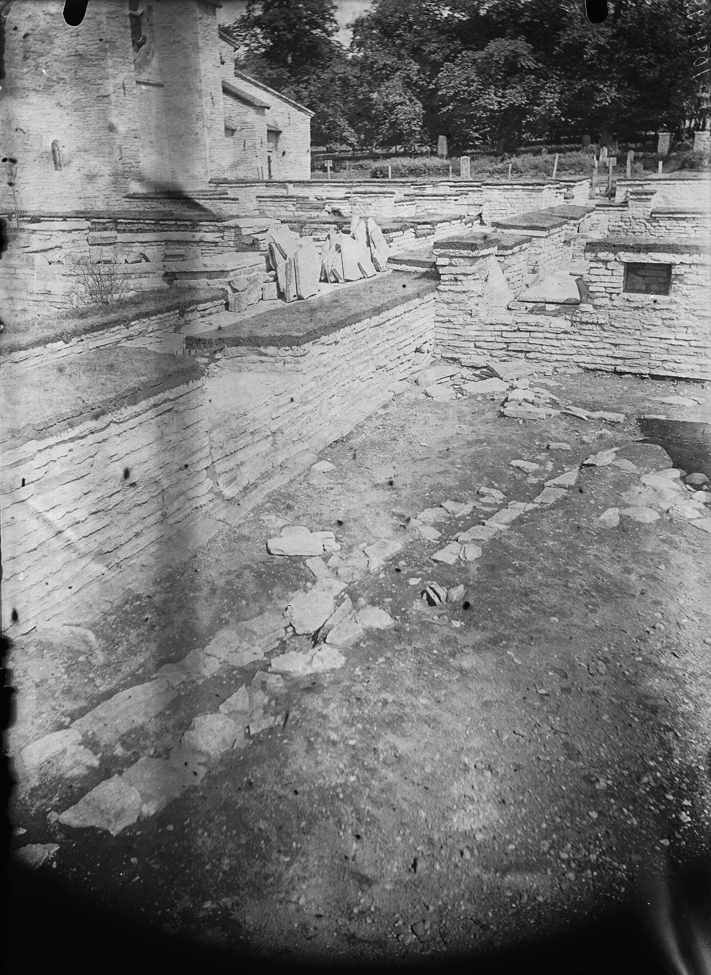 Den genom köket gående kalkstensbyggda kanalen blottad. I rummets bortre hörn en kalkstensmurad brunn. Från västsydväst.