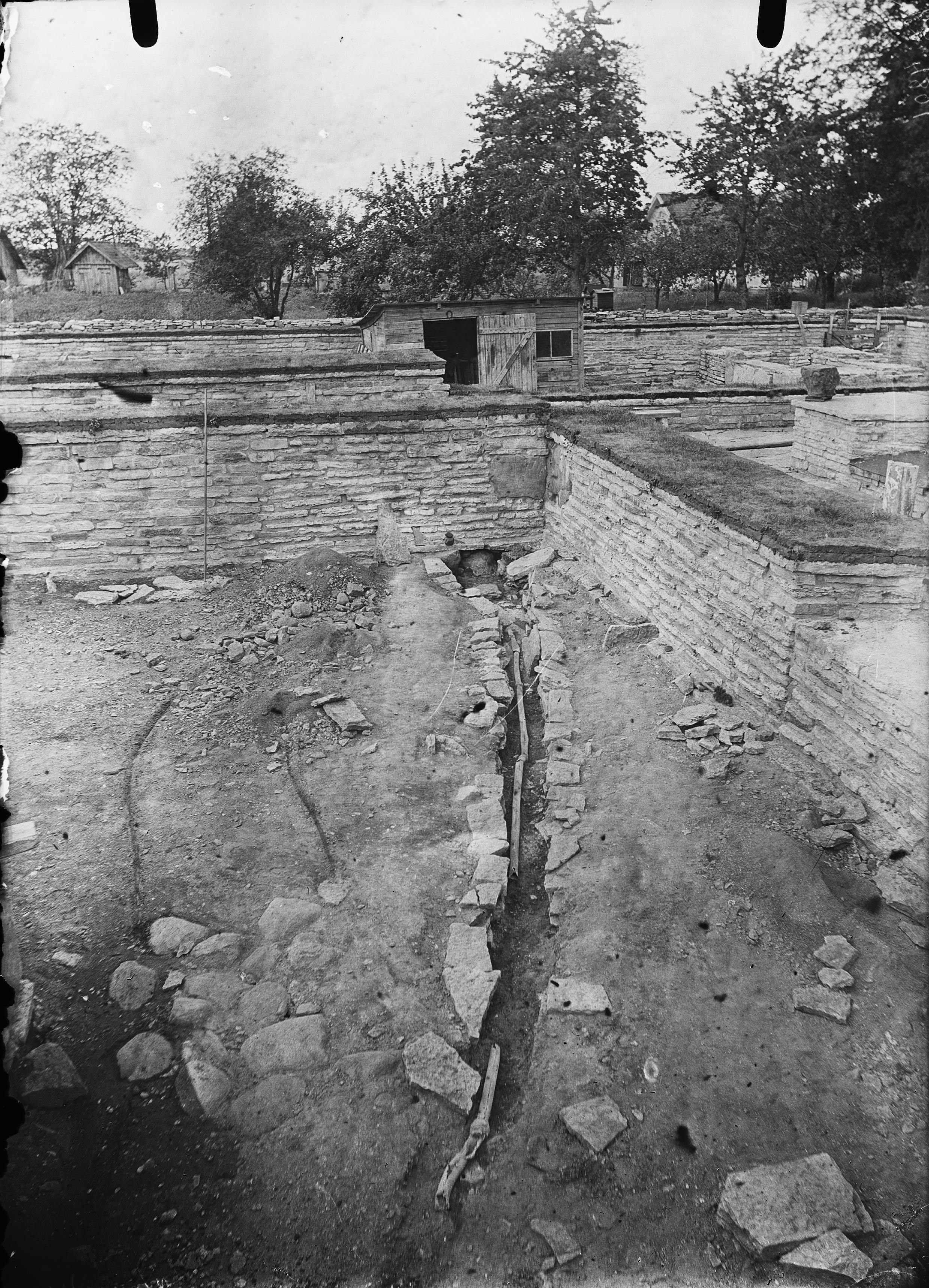 Köket. Kanalen utgrävd med blyrörledningen helt blottad. Till vänster pelargrunden. Från östsydöst.
