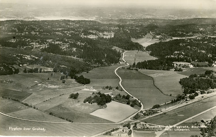 Enligt Bengt Lundins noteringar: "Flygfoto över Grohed. Jvg och landsväg".