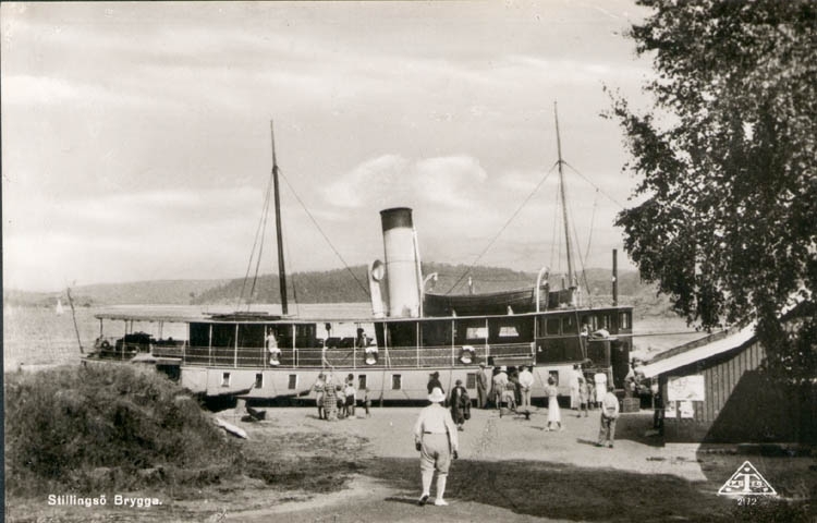 Ångbåten Kung Rane, rederiet Bohuslänska Kustens flaggskepp, vid Stillingsöns brygga. Badortsdirektören och ångbåtskommissionären Malte Bernzon i förgrunden