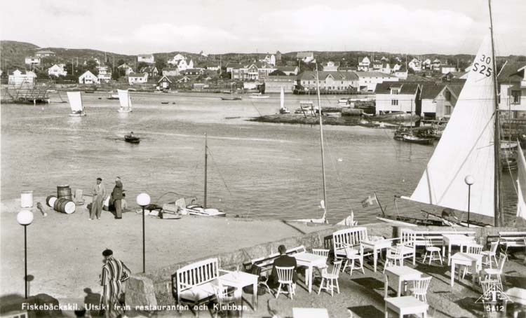 Tryckt text på kortet: "Fiskebäckskil. Utsikt från Restauranten och Klubban."