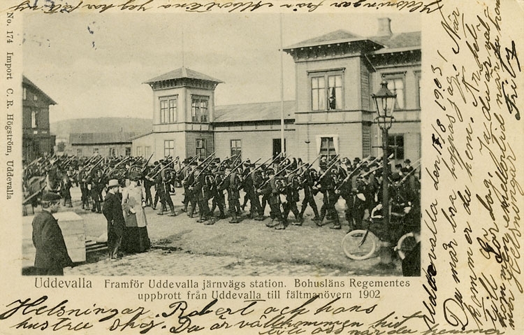Enligt Bengt Lundins noteringar: "Uddevalla. Framför Uddevalla järnvägsstation. Bohusläns Regementes uppbrott från Uddevalla till fältmanöver i Närke".