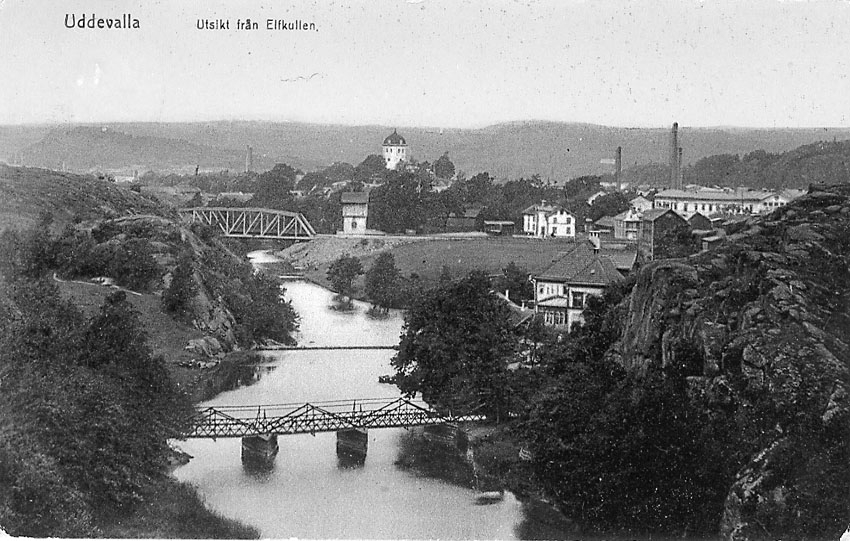 Tryckt text på vykortets framsida: "Uddevalla utsikt från Elfkullen".