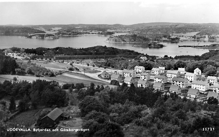 Tryckt text på vykortets framsida: "Uddevalla. Byfjorden och Göteborgsvägen."