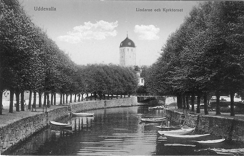 Tryckt text på kortets framsida: "Uddevalla Lindarne och Kyrktornet