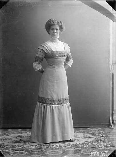 Enligt senare noteringar: "Ateljéfoto av en dam klädd i lång klänning."