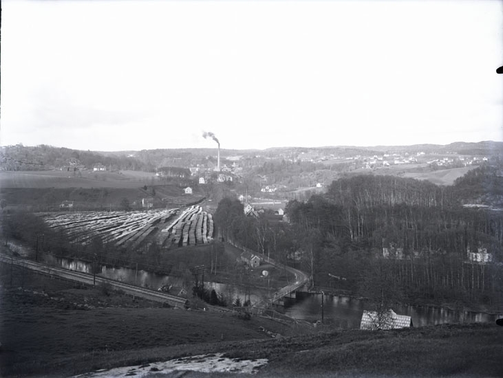 "1931. nr. 40. 1. 12 sek. med papper över en lampa. Bohusbanan i förgrunden, Munkedals fabrik i bakgrunden."