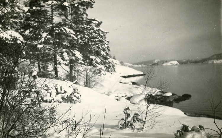 Enligt Bengt Lundins noteringar: "Stillingsön. Strandklippor i vinterskrud".