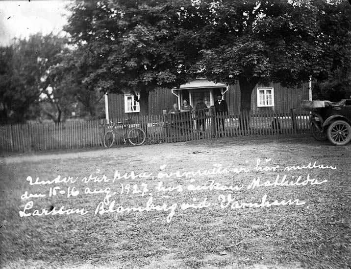 Enligt text på fotot: "Under vår resa övernatta vi här mellan den 15-16 aug. 1927 hos änkan Mathilda Larsson, Blomberg vid Varnhem".