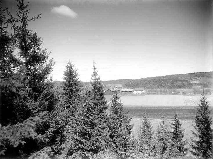 Granskog i förgrunden, därbortom åkrar, fält och berg. Gården Kalsås vid skogskanten, gården där John Johannes Calråhs växte upp.