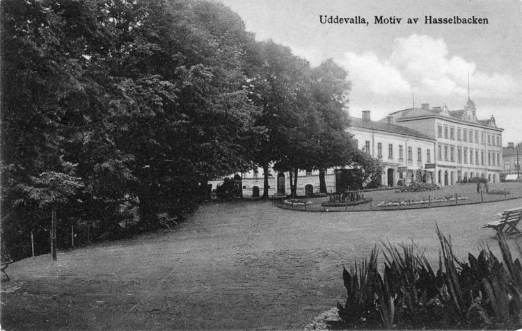 Tryckt text på vykortets framsida: "Uddevalla, Motiv av Hasselbacken."