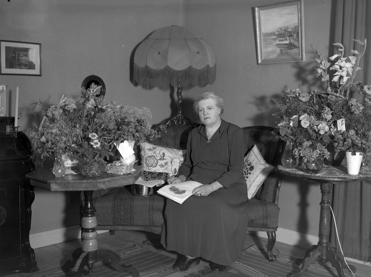 Text som medföljde bilden: "1955. No. Selma och Elin Sahlberg. Elin ensam med blomma på sin 70-årsdag. Selma 2 1/2 år äldre privat".